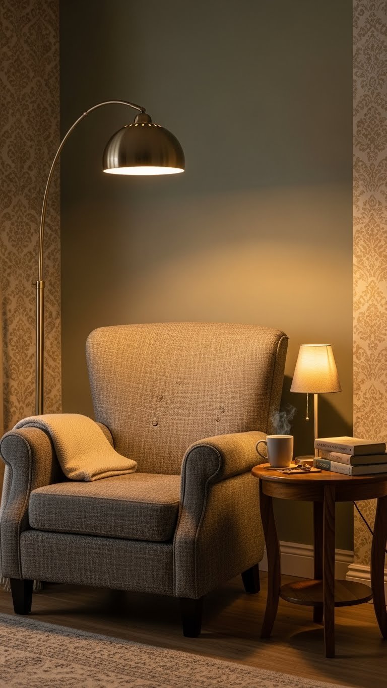 Dedicated reading nooks need dual task lighting to prevent eye strain. Combining a floor lamp and table lamp creates flexibility and eliminates shadows.