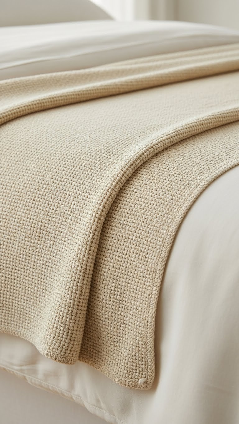 Buy a chunky knit throw ($40-$100 from West Elm, H&M Home, or independent makers on Etsy) in wool, cotton, or linen. Drape it over the foot of your bed or the side for easy access. Spot-clean or hand-wash gently. These work year-round—summer nights when you want light texture, winter when you layer under or over your regular blanket.