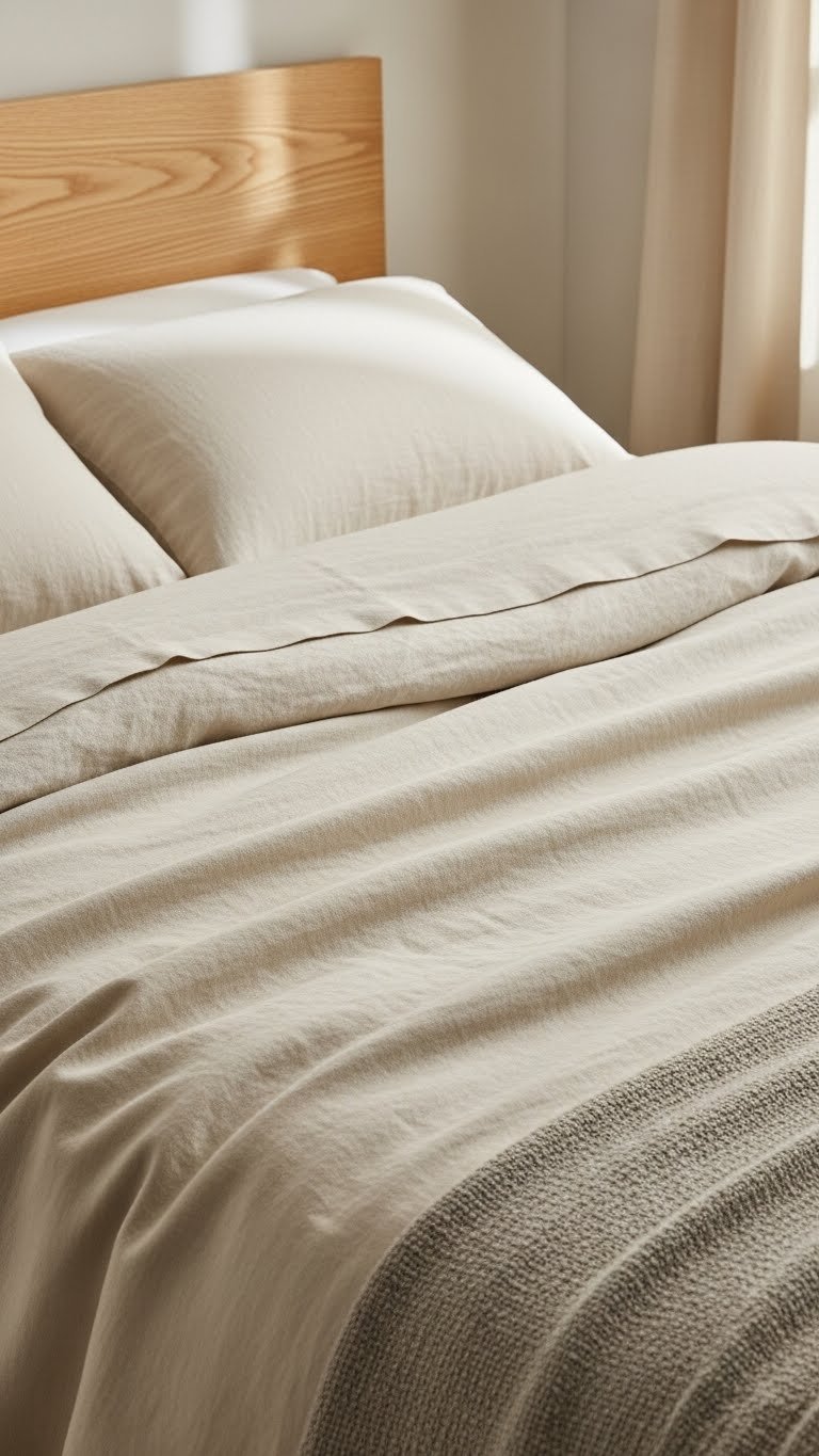 Start with a quality linen sheet set as your base layer directly on the mattress—$60-$120 for a good set from IKEA, Bed Bath & Beyond, or Parachute. Add a lightweight linen duvet cover on top ($80-$180). The magic happens when linen sheets wick moisture away while still feeling cool to the touch. Pair with a duvet insert in summer (breathable cotton) and switch to a heavier insert in winter. Time to switch: five minutes per season.
