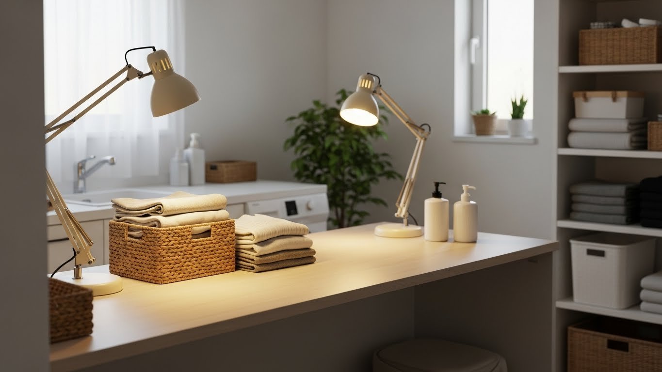 Poor lighting makes folding harder and strains your eyes. LED task lighting positioned directly above your folding counter changes everything—you see stains, colors, and wrinkles clearly, and you work faster.