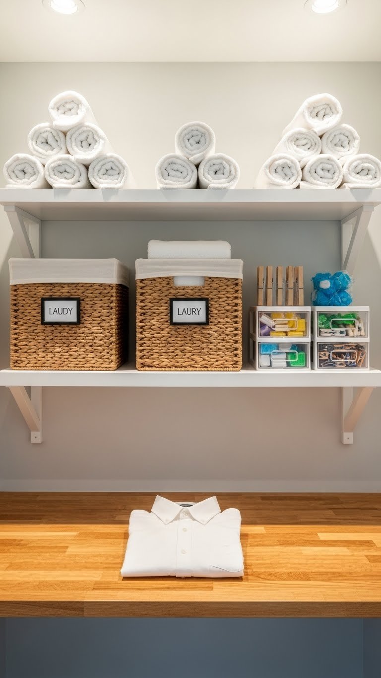 Vertical storage keeps supplies within arm’s reach and makes your station feel intentional rather than cluttered. Floating shelves above your folding counter hold rolled towels, stain treatments, lint rollers, and baskets.