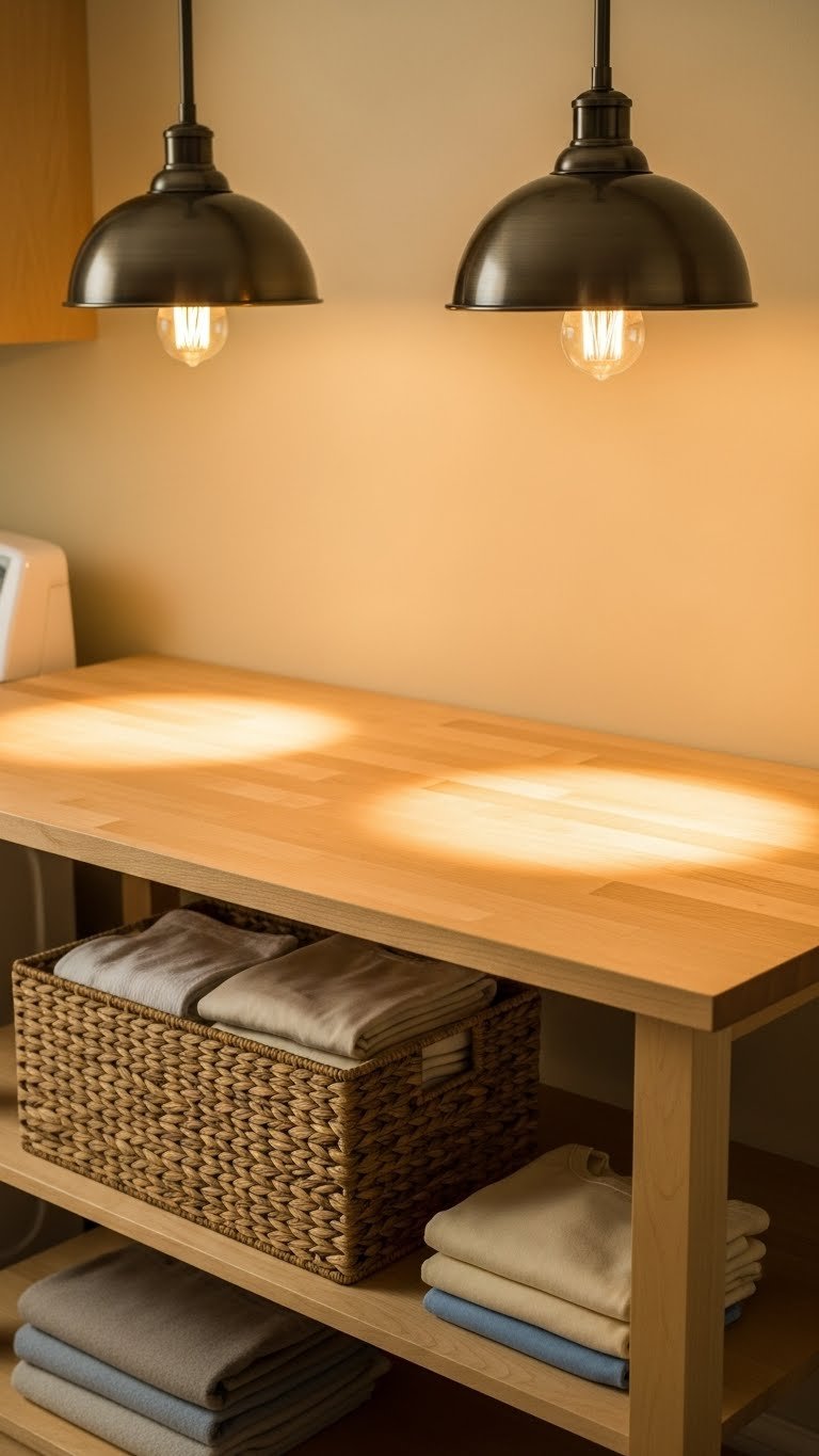 Beyond task lighting, ambient light makes your folding station feel less like a chore zone and more like a pleasant space. Warm lighting specifically improves mood and makes you more likely to fold promptly.