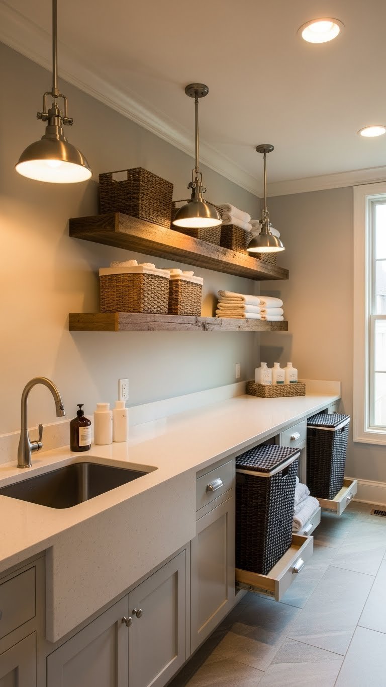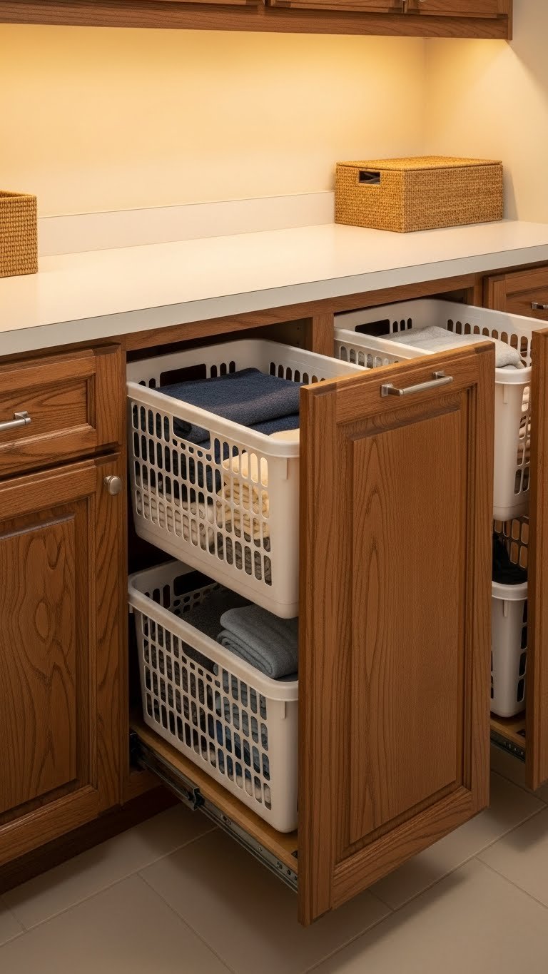 Having separate baskets for clean, folded, and ready-to-put-away items keeps your folding station organized and speeds up the whole process. Pull-out hampers built into cabinetry make sorting effortless.