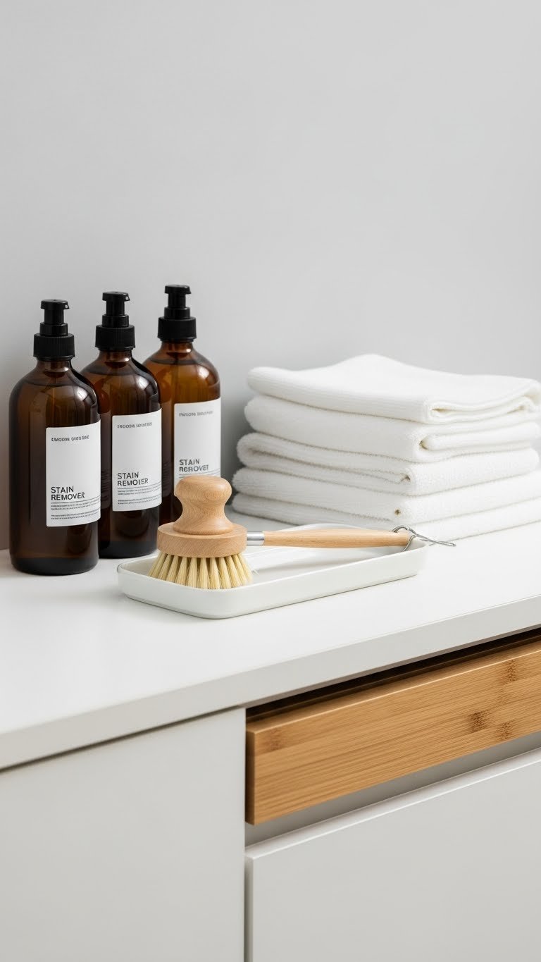 You need about 2–3 linear feet of counter or shelf space. Stock it with stain remover spray ($5–$12), a soft brush ($3–$8), white cloths, and a small spray bottle of water. A small rolling cart ($40–$80) from IKEA or Target gives you mobile storage that rolls between laundry and folding areas. Setup takes 30 minutes and costs under $50 if you’re starting from scratch.