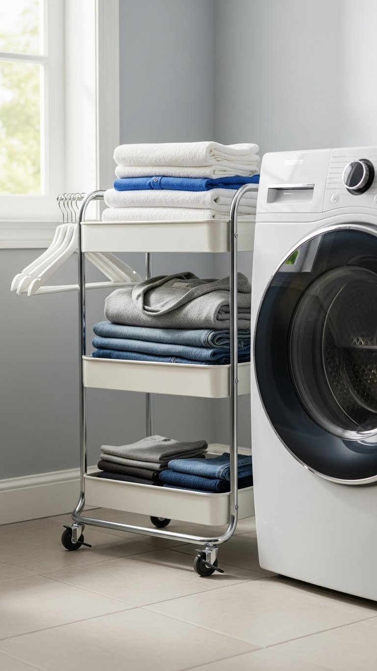 Metal or wood rolling carts range from $40–$150 depending on size and material. Look for sturdy construction with lockable wheels (non-locking carts are frustrating). IKEA’s PINNIG cart is popular at $40–$60, while fancier versions from Container Store run higher. Assembly takes 15–30 minutes. Pro tip: Use each tier for different categories—bottom tier for folded items, middle for items being worked on, top for small accessories.