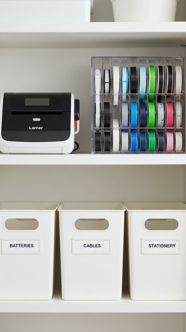 A basic label maker costs $15–$30 (Brother and Dymo make affordable ones), and label tape is $5–$15 per roll. The label maker sits on your folding counter or nearby shelf and takes seconds per label. Setup time: 10 minutes. Pro tip: Use color-coded label tape for different room categories or family members.