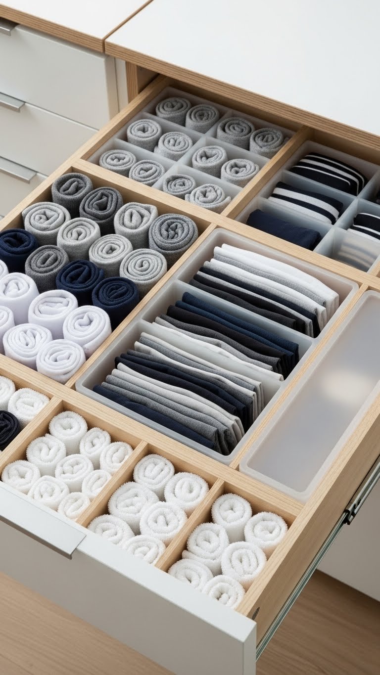 Wooden or plastic drawer dividers cost $15–$40 per set, and you can customize lengths. Installation takes 15 minutes (most are just wedged in place or stick on). Use one drawer for socks and small items, another for towels, another for delicates. Pro tip: Choose adjustable dividers so you can reconfigure as needs change.