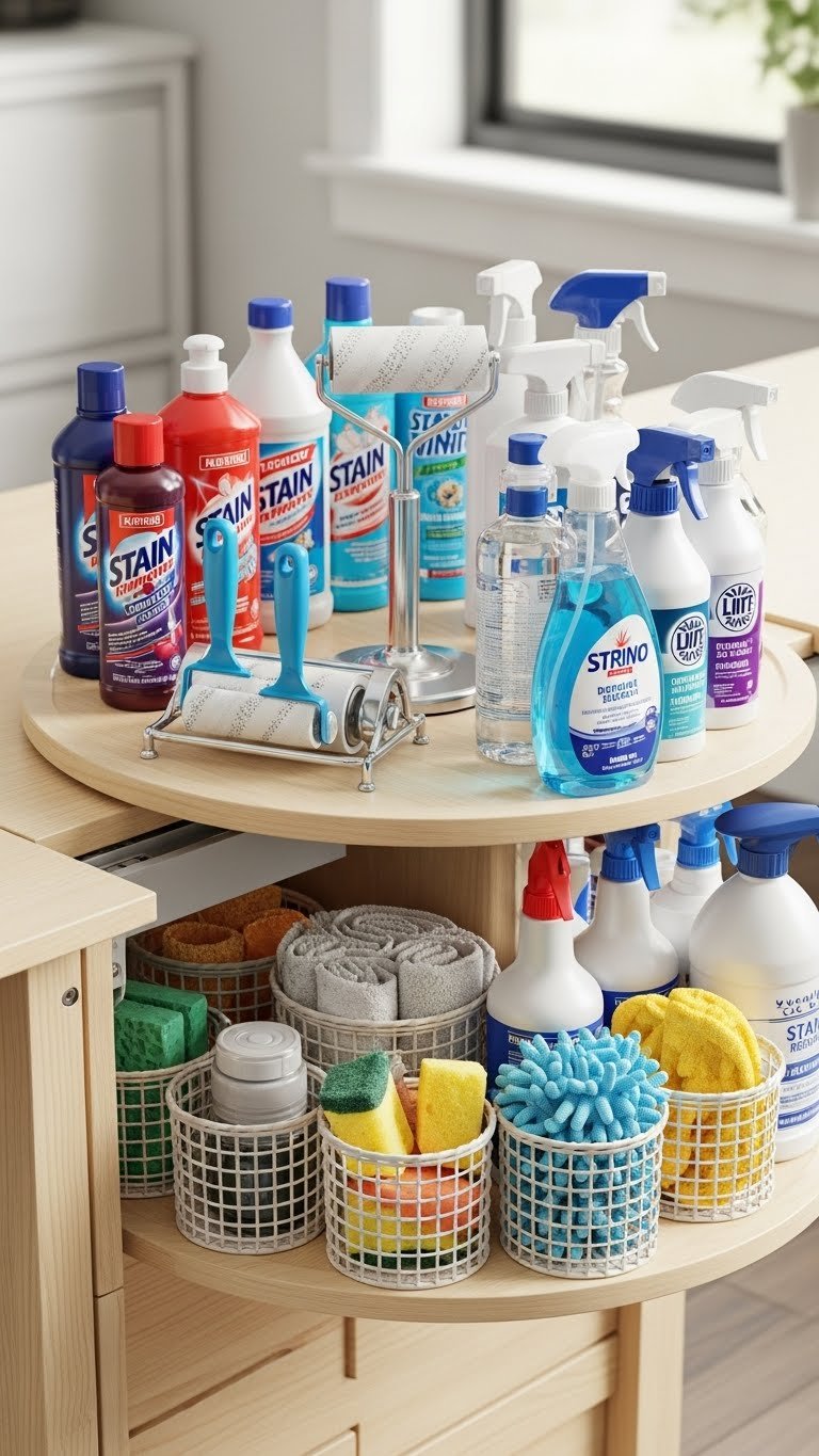 A lazy Susan or rotating carousel keeps small supplies organized and within a rotation’s reach. Everything’s visible, nothing gets lost in the back of a shelf, and you use floor or counter space efficiently.