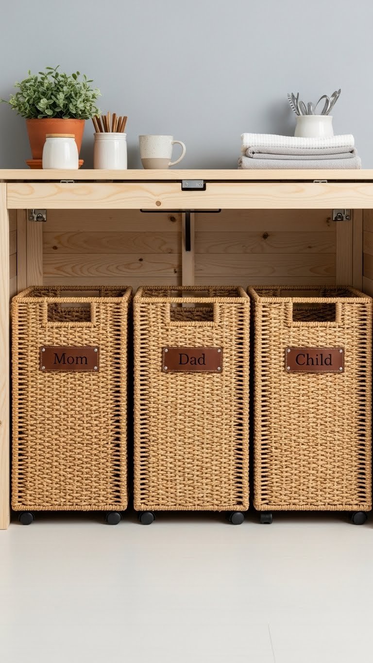 Rolling baskets cost $20–$60 each from Target, IKEA, or Container Store. Get 3–5 depending on household size. Label each basket with names or use color-coding. Total investment: $60–$300. Setup takes 20 minutes. Pro tip: Keep baskets under the counter when not in use so your folding space stays open.