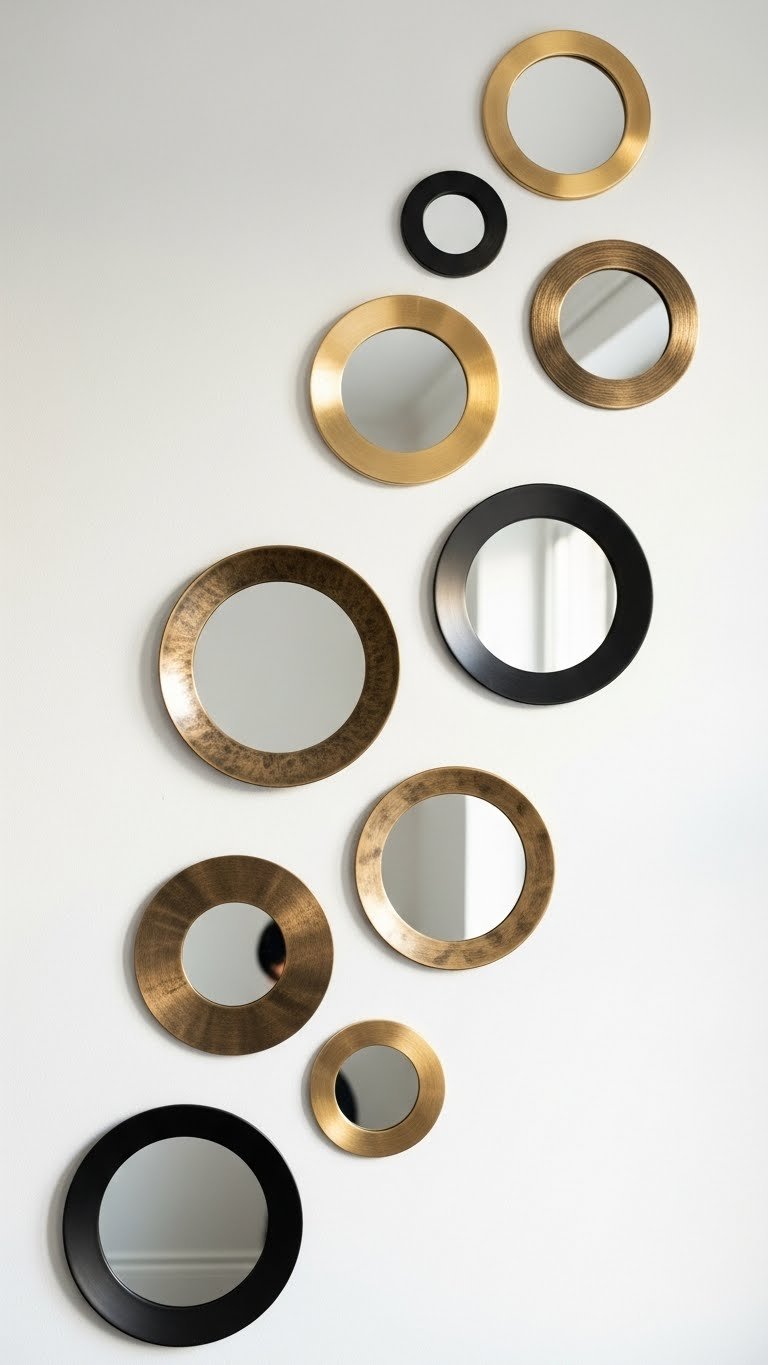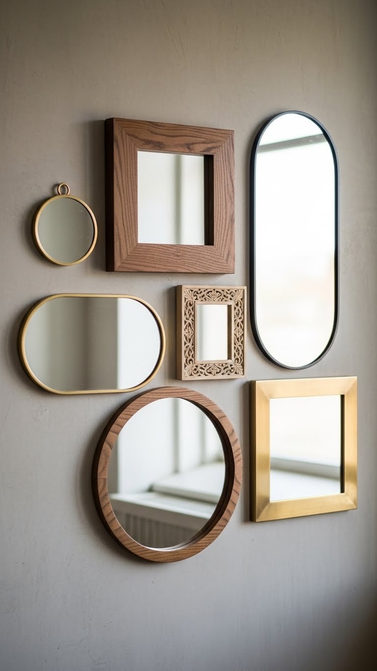 Map out your arrangement on paper first or use painter’s tape on the wall to plan spacing. Combine styles: a round gold-framed mirror next to a square wooden one, then an arched black metal frame. Prices vary wildly—grab affordable options at Target, IKEA, or thrifted, ranging $15–$150 per piece. Space them 4–6 inches apart for a curated look. Installation takes a few hours but pays off visually for months.