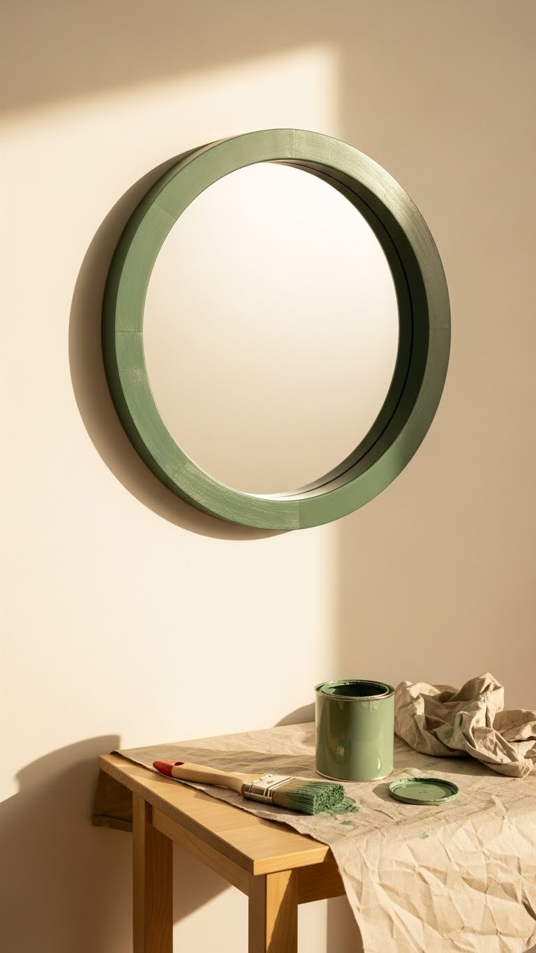 Grab a cheap round mirror at IKEA or thrifted ($10–$30). Choose paint that matches your wall trim, accent color, or textiles. Use spray paint for smooth results (30 minutes dry time) or brush-on acrylic for control. Prime if needed, then seal with matte or satin topcoat for durability. Total cost: under $30. Installation: 15 minutes with a nail or D-ring hanger.