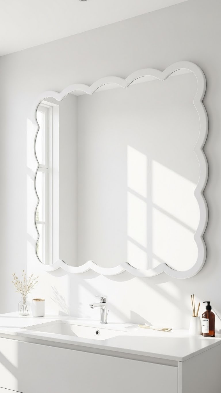 Hunt for scalloped mirrors on Etsy, Wayfair, or Amazon, typically $70–$180 for larger statement sizes. Wood or painted metal frames keep the vibe fresh. Center above a bathroom vanity or console for maximum visual impact. Mounting takes 15 minutes with a French cleat or standard D-ring hanger.