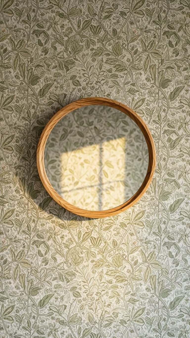 Choose a wallpaper with small repeating patterns (geometric, botanical, or subtle texture work best). Mount a round or oval mirror directly over it using standard hardware. Mirror cost: $30–$100. Wallpaper: $20–$50 per roll depending on quality. Takes one afternoon to wallpaper and one hour to hang the mirror.