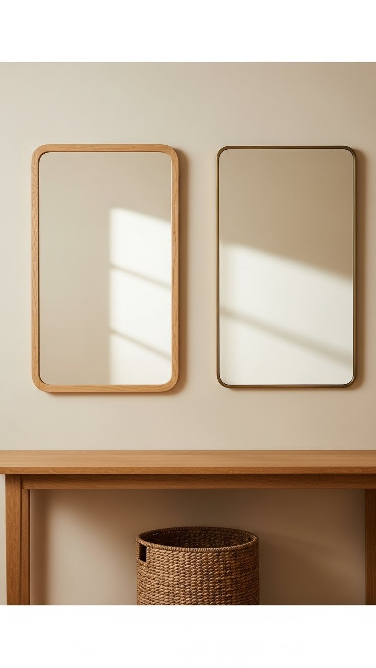 Choose simple rectangular or slightly rounded mirrors in both materials. Find them at IKEA, Wayfair, or West Elm, typically $40–$120 each. The clean lines matter more than exact size—varied widths (18 inches and 24 inches) look better together. Mount at the same height, 2–4 inches apart. Takes 30 minutes to hang both securely.
