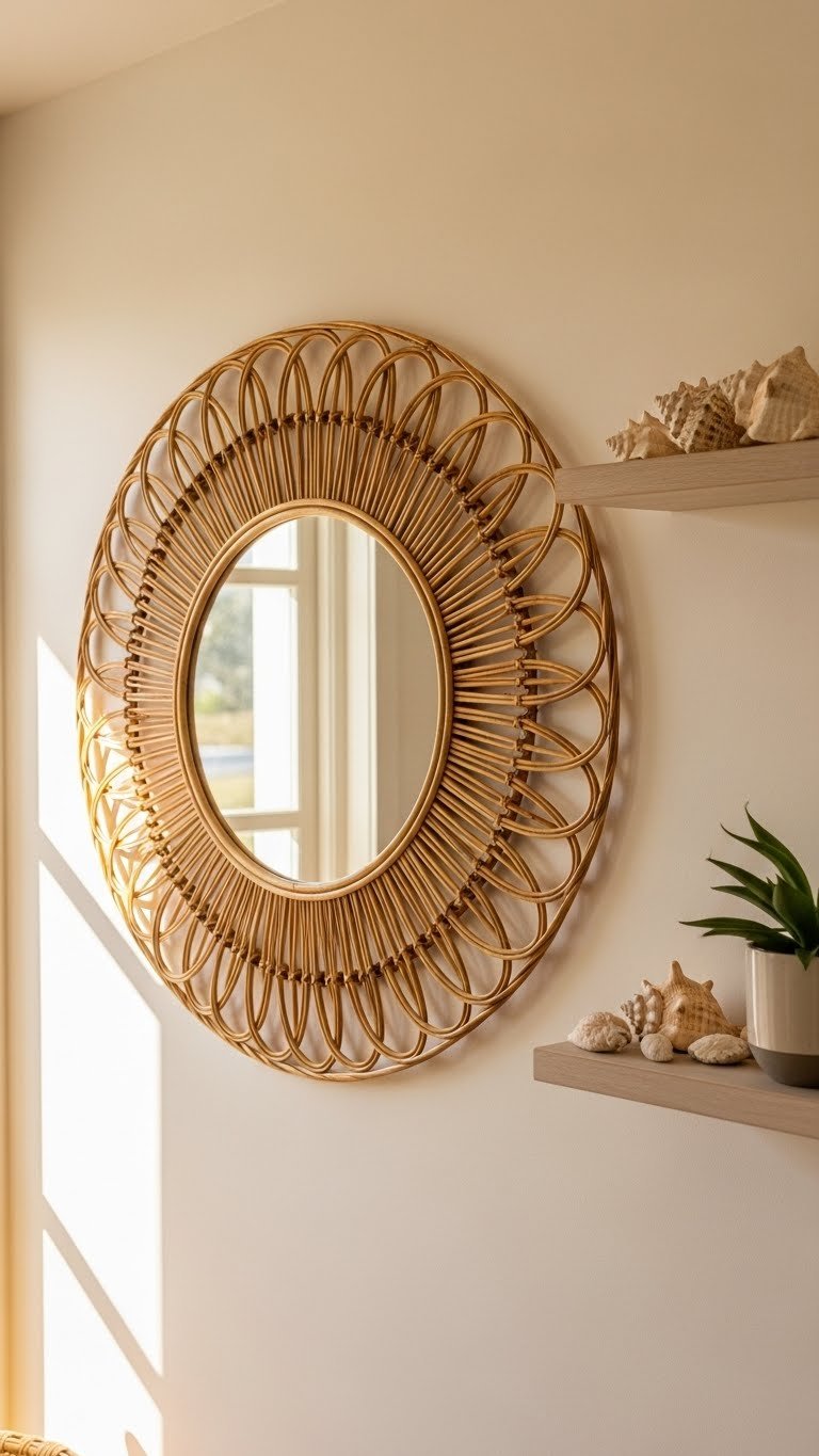 Look for rattan-framed mirrors at IKEA, West Elm, Wayfair, or Etsy, ranging $60–$180. Round shapes work best with rattan, but rectangular options exist too. The woven texture pairs well with other natural elements—wood, plants, woven baskets. Mount securely (rattan frames are deceptively heavy). Takes 15 minutes to hang.