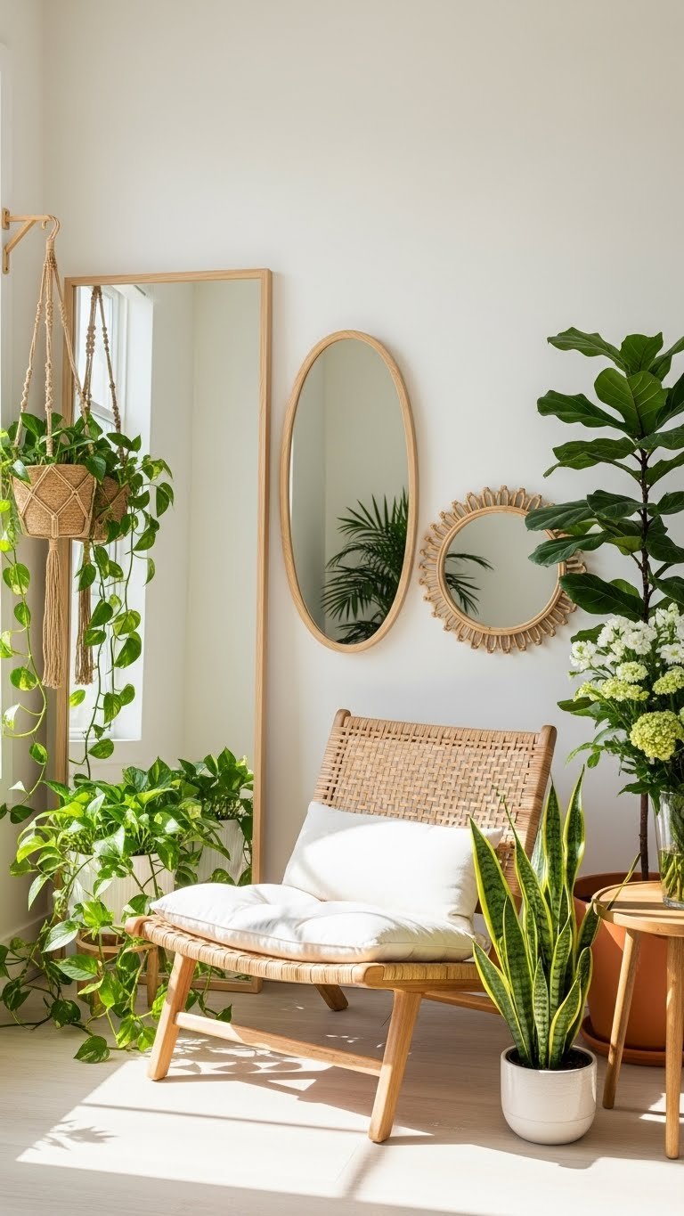 Mix mirror sizes (24″, 30″, 36″) and styles (round wood, rectangular metal, arched frame). Gather from IKEA, Wayfair, thrifted stores, or Instagram small businesses. Budget $80–$250 total. Lean them in a corner with natural light, then style around them with plants or a chair. Rearrange as often as you want (zero installation required).