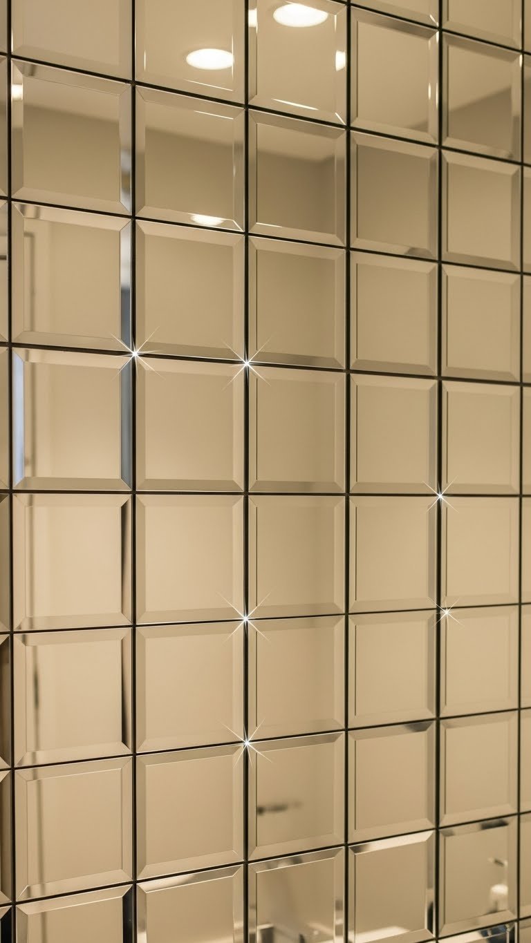 Order beveled mirror tiles from Home Depot, Amazon, or specialty tile sites ($2–$5 per tile). A 15-tile wall (for a 5×3 grid) runs $30–$75. Install with construction adhesive or thin-set mortar for a permanent look. Takes two to three hours for DIY installation. For professional help, budget $300–$600 labor.