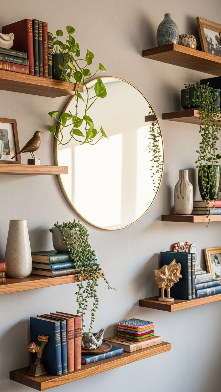 Mount a simple mirror above or between shelves using standard hardware. Choose one that complements your shelf styling. Cost: $20–$80. Takes 15 minutes to install and style around existing shelf objects.