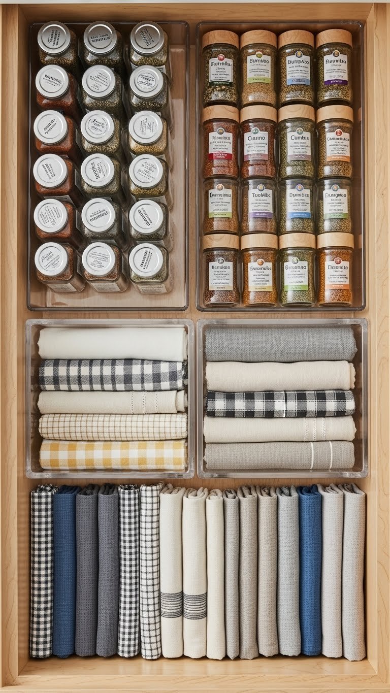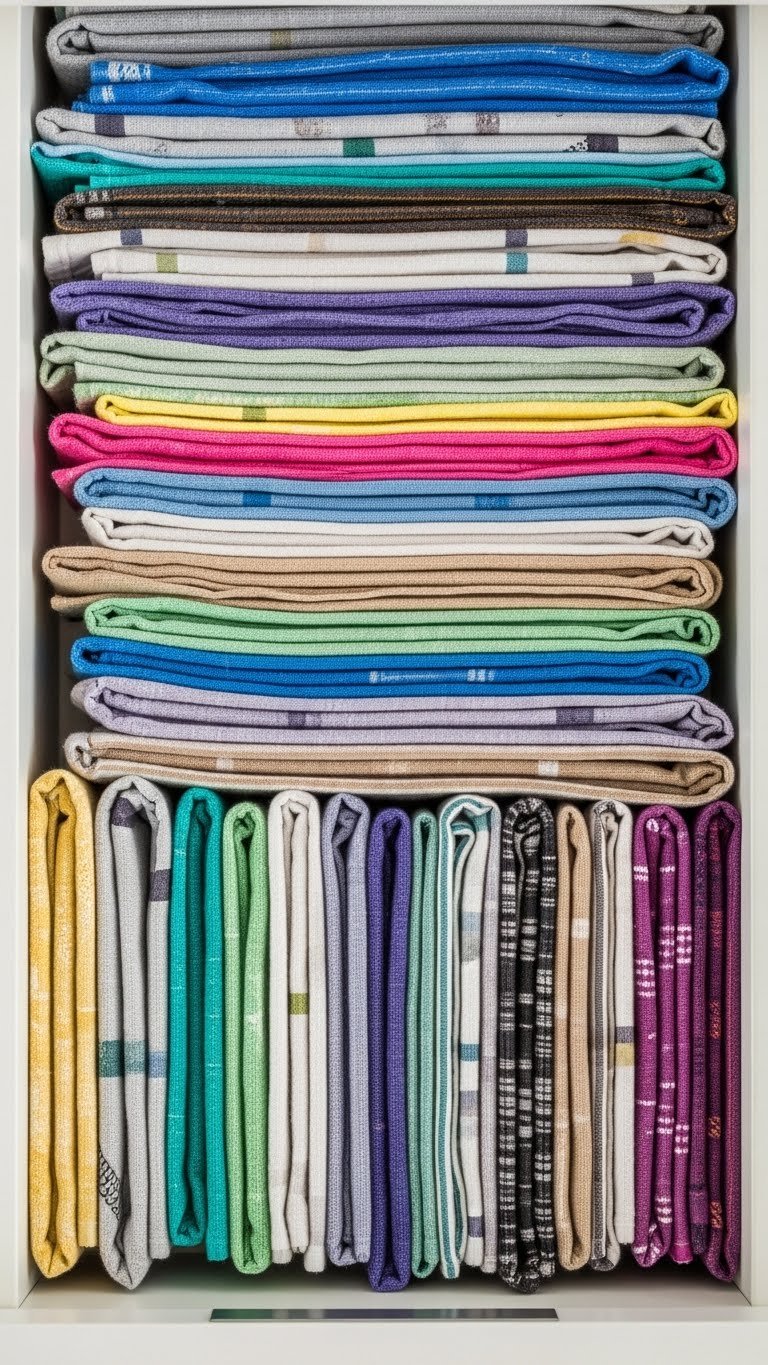 Fold tea towels or kitchen linens to a uniform size (usually 5-6 inches wide), then stand them vertically in your drawer like files. This works if you have a divider card, a small box, or drawer dividers to hold them upright. If your drawer is deep, you might fit 15-20 folded towels in the space a traditional stack would take 8.
