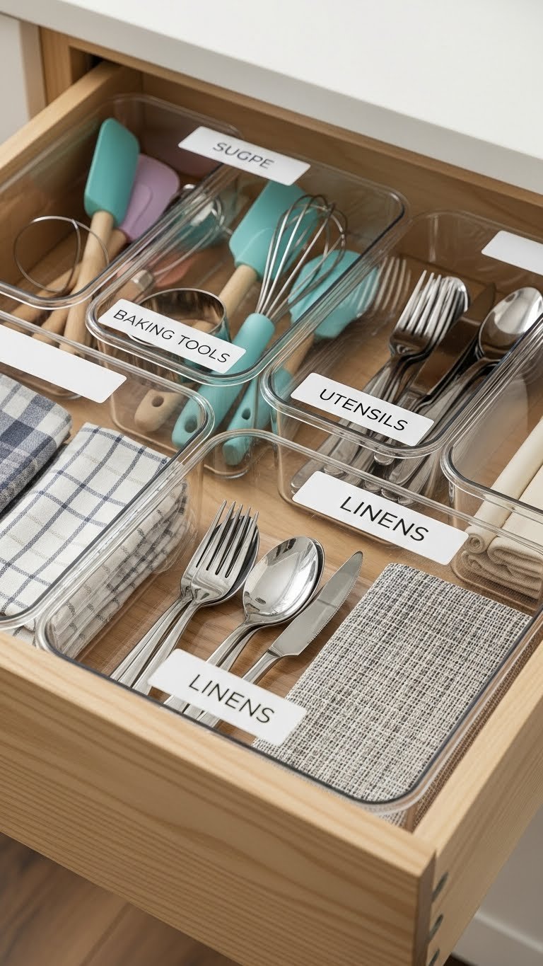 Grab a set of drawer-sized clear containers ($15–$35 from The Container Store, IKEA, or Target). Look for stackable designs with lids, about 4-6 inches deep. Fill each one with a specific category: cooking tools, tech cables, first-aid supplies, beauty products, whatever you store in that drawer. Leave a finger-width of space around edges so items don’t jam when you slide containers.