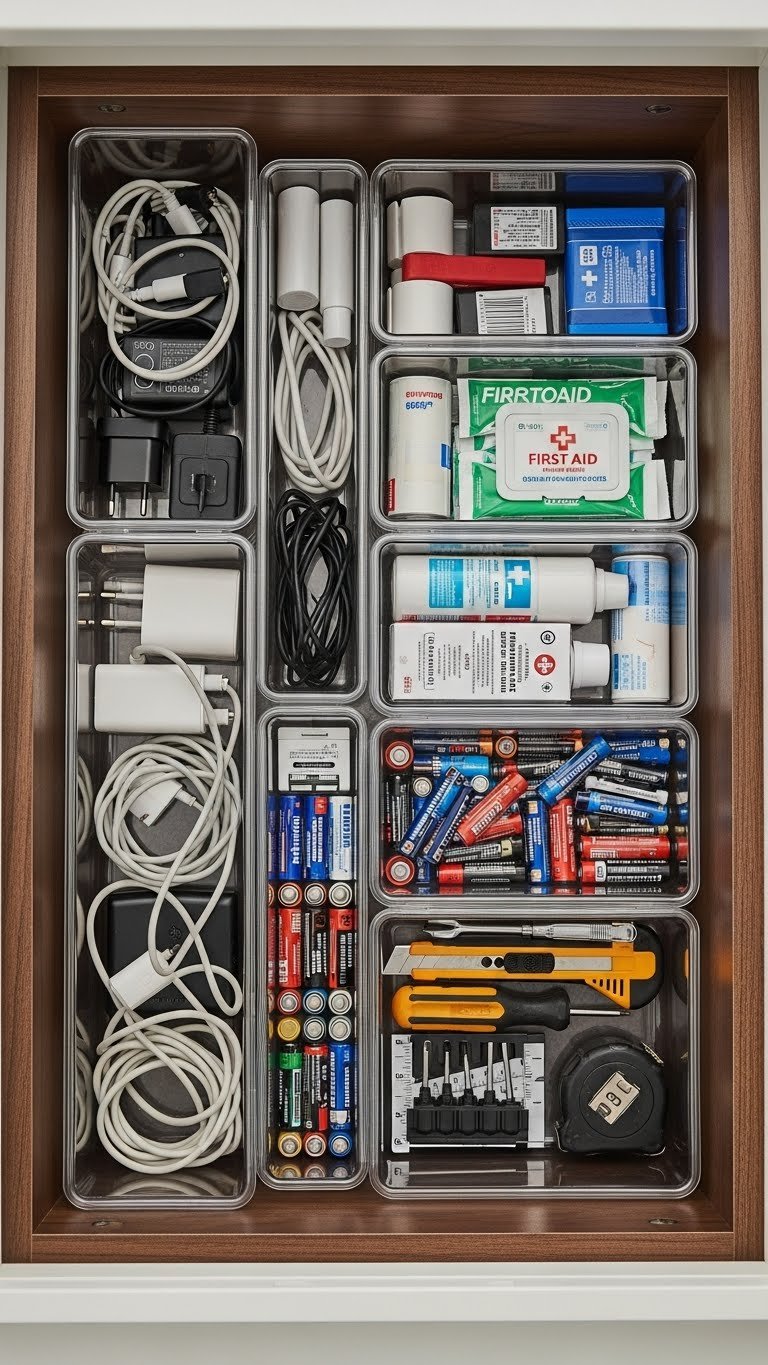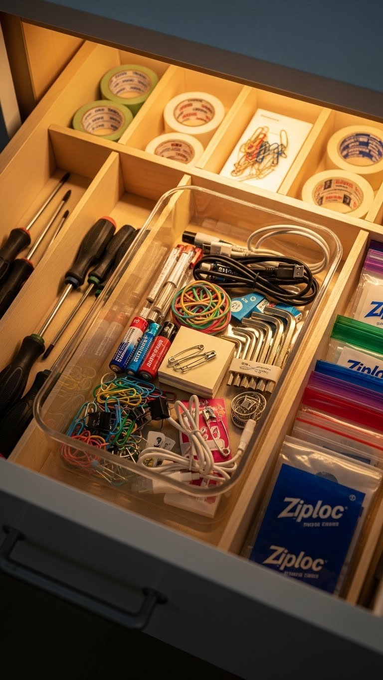 Place a medium clear container ($8–$15) inside your larger drawer. Use it as your official “junk drawer” section—clips, batteries, safety pins, random hardware, all in one spot. This keeps chaos contained while giving it a legitimate home. Your brain stops wandering why you can’t find rubber bands because you know exactly where the miscellaneous container lives.