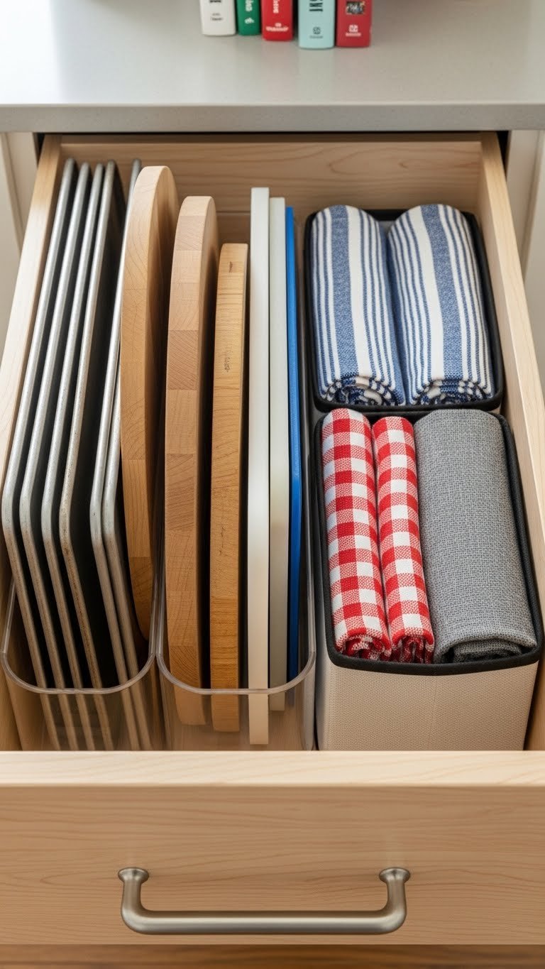 Pick up vertical drawer divider boxes ($20–$40 from IKEA, Container Store, or Amazon). These look like file organizers but designed for drawers. They’re perfect for linens because you can pull out the exact one you need without disturbing the stack. They also work for baking sheets, cutting boards, and large flat tools.