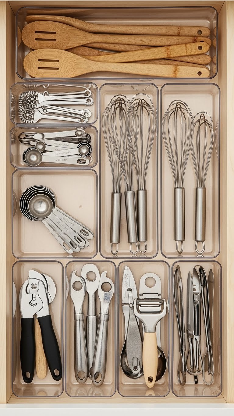 Find acrylic drawer dividers ($15–$35 from Container Store, Amazon, or Design Within Reach). They’re adjustable, durable, and won’t discolor over time like some plastics do. They work especially well in modern kitchens or if you have a light-colored drawer. Mix clear acrylic with a few labeled wooden dividers for visual interest.