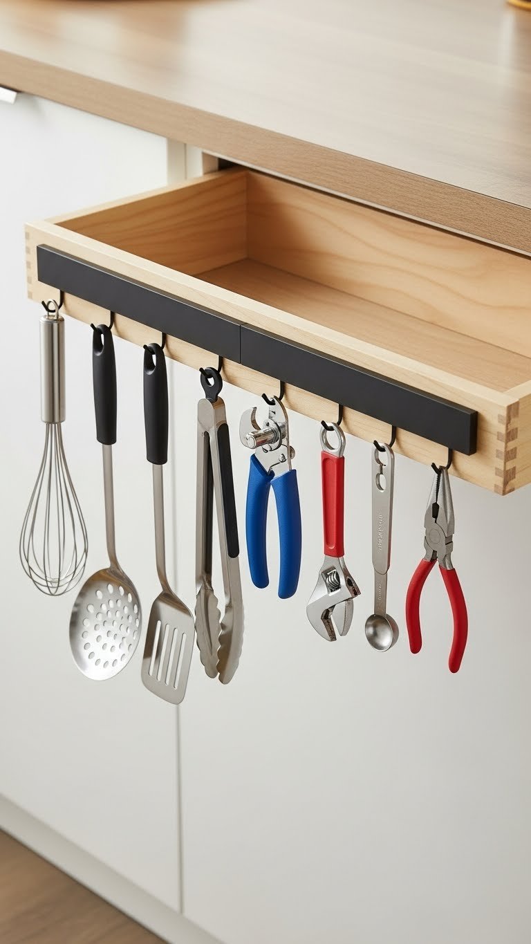 Pick up self-adhesive magnetic strips ($10–$20 from Amazon, IKEA, or hardware stores). Mount them vertically on one side or end of your drawer. Hang metal utensils, scissors, or small tools from them. This works especially well for deep drawers where space is at a premium. Make sure your utensils are actually magnetic first (most metal ones are, but not all).