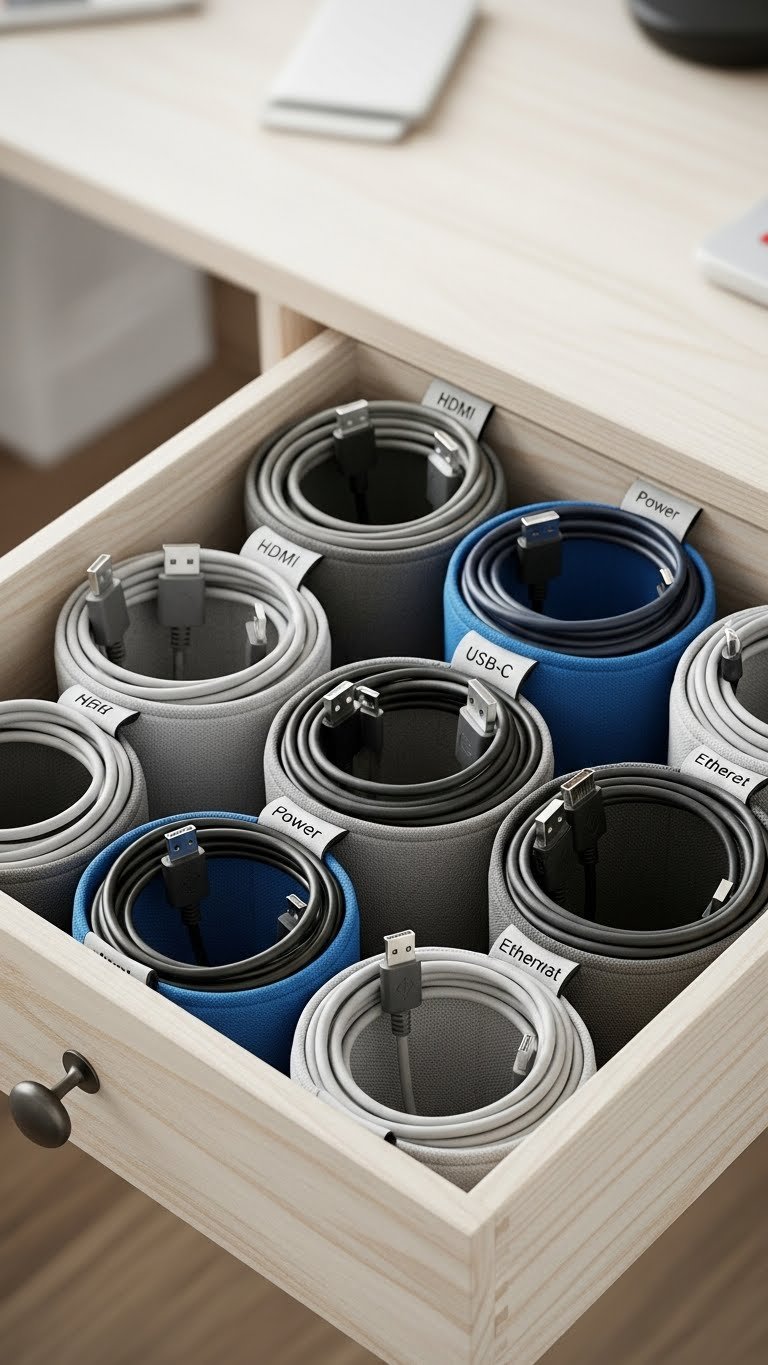 Buy cord organizer clips or boxes ($10–$20 from Amazon, Best Buy, or Target). Velcro cable ties work too. Coil each cable loosely and secure it with one tie, then place all cords in a small container or stack them vertically in your drawer divider. Label each cable if your household has multiple chargers. Keep frequently-used chargers in the front, backups in the back.