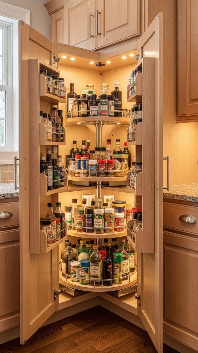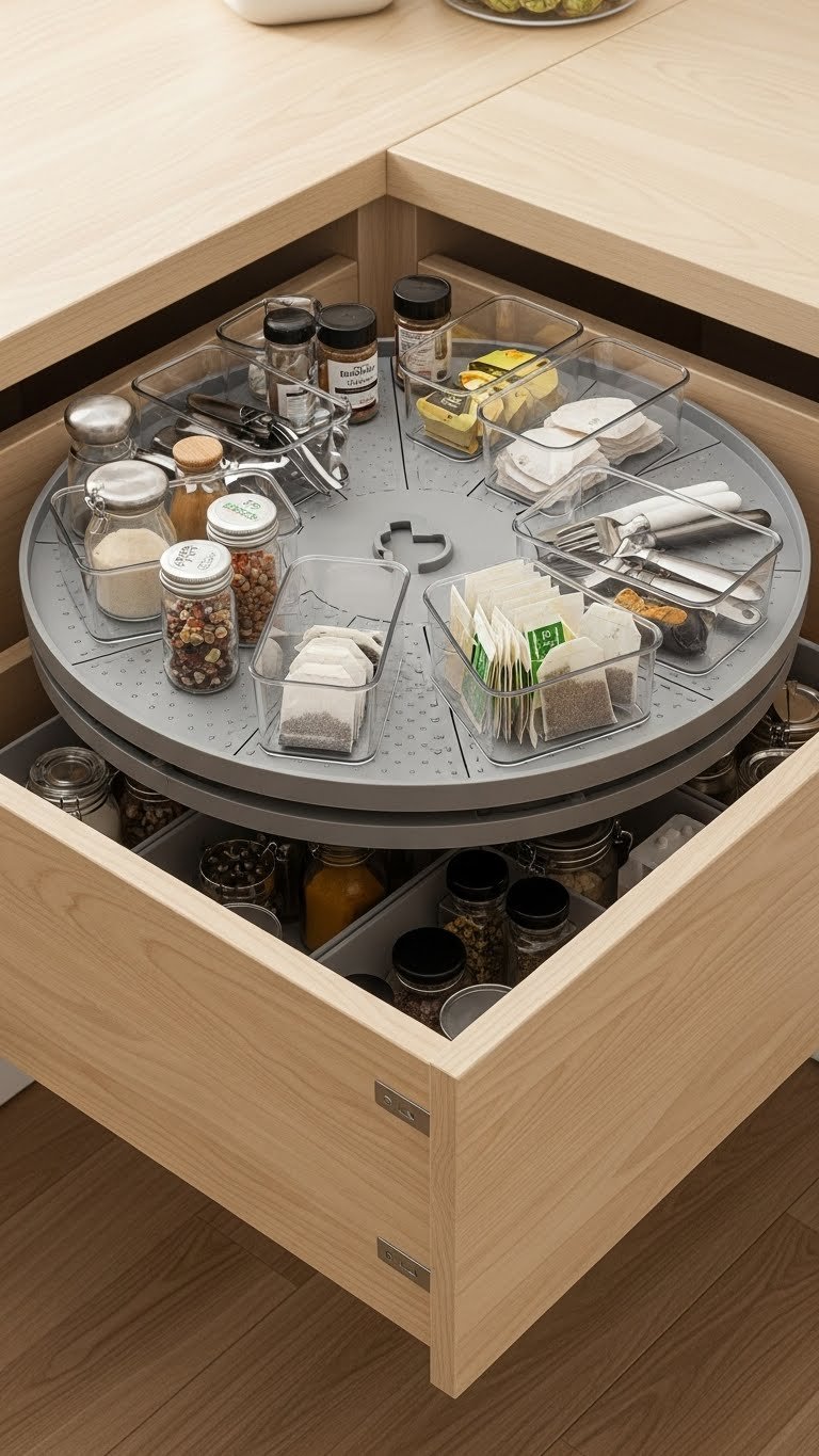 Corner drawers are awkward—you can’t reach the back without contorting. A rotating organizer solves this.