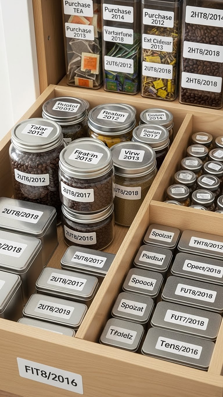 Use a label maker or permanent marker to write the purchase date or expiration date on top of containers, boxes, or bags. Stack them with oldest on top, newest on bottom—this forces rotation. This is crucial for tea, spices, supplements, medications, or anything that loses potency over time. Check dates quarterly and toss expired items.