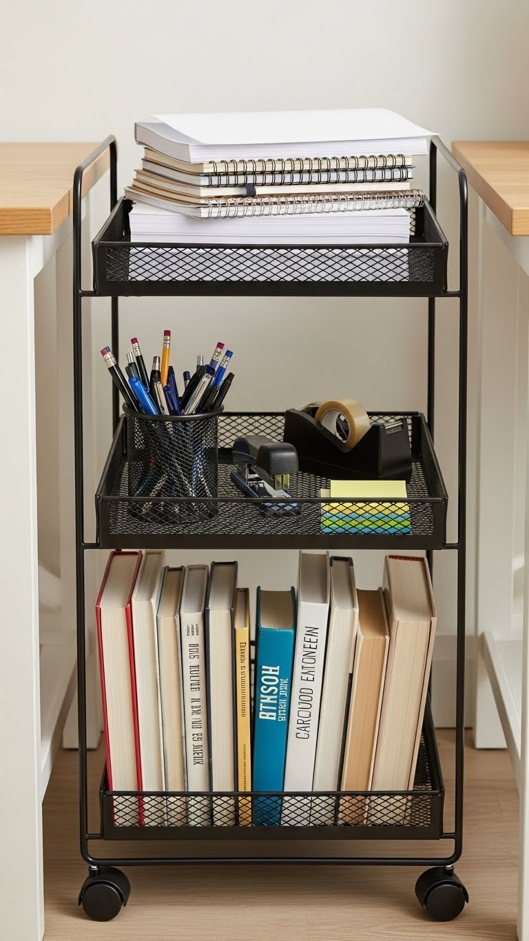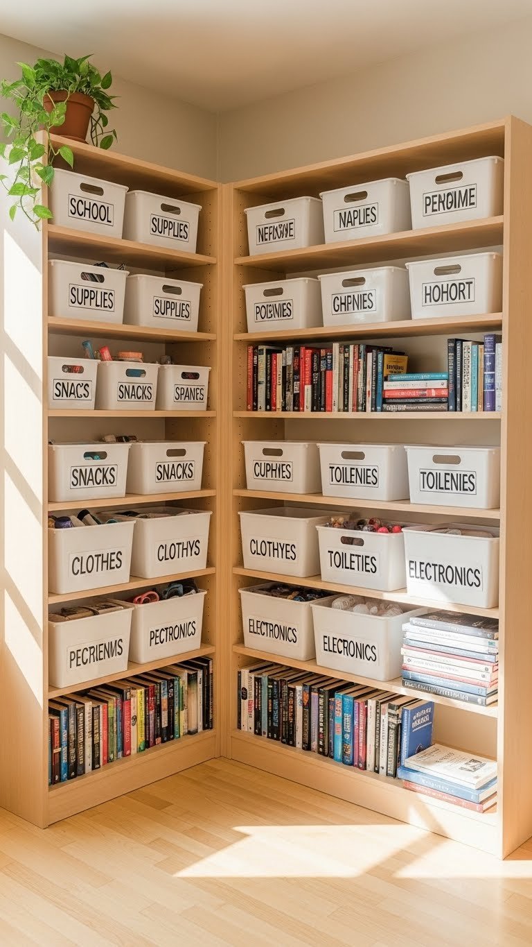 Place woven baskets, storage boxes, or containers ($15-$50 each from Target, IKEA, or HomeGoods) on lower shelves or to one side of your bookshelf. Fill them with items you use frequently but don’t necessarily want on display—extra journals, office supplies, blankets, or magazines. Keep upper shelves more open and visible. This balance prevents the space from feeling either too cluttered or too empty.