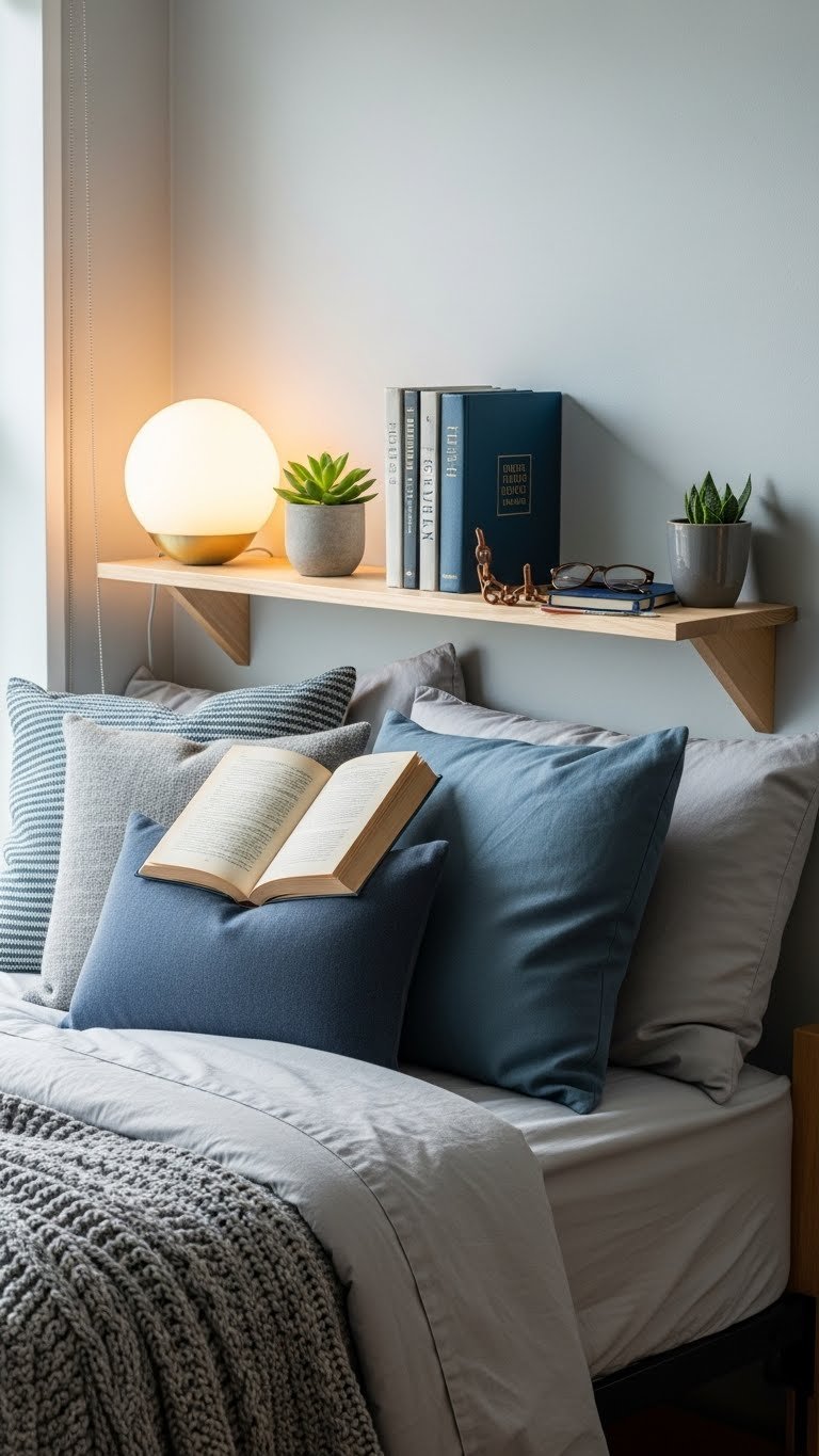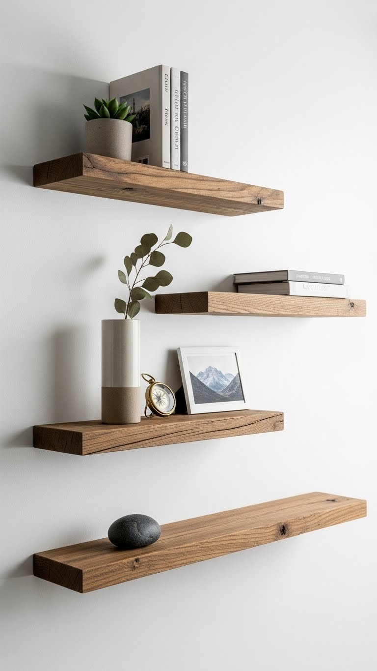 Floating shelves give you flexible storage without the commitment of a full bookcase, making them perfect for renters or anyone still figuring out their layout. They’re especially effective when arranged asymmetrically.