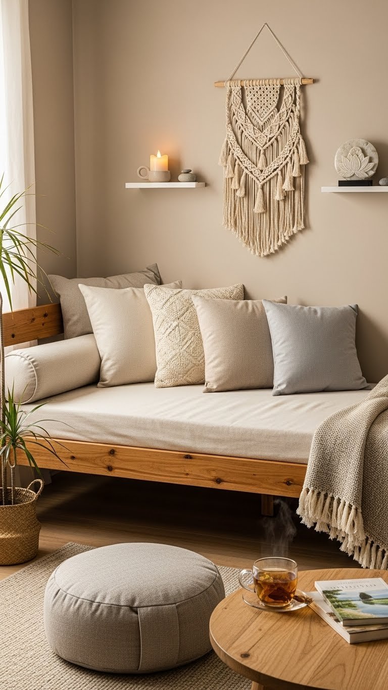 Position a meditation cushion, bench cushion, or small chair ($20-$80) directly in front of a low bookshelf. Add a side table for tea or coffee, drape a soft blanket nearby, and position a reading lamp at eye level. Choose a corner with natural light if possible. This takes about 15 minutes to arrange and requires zero installation.