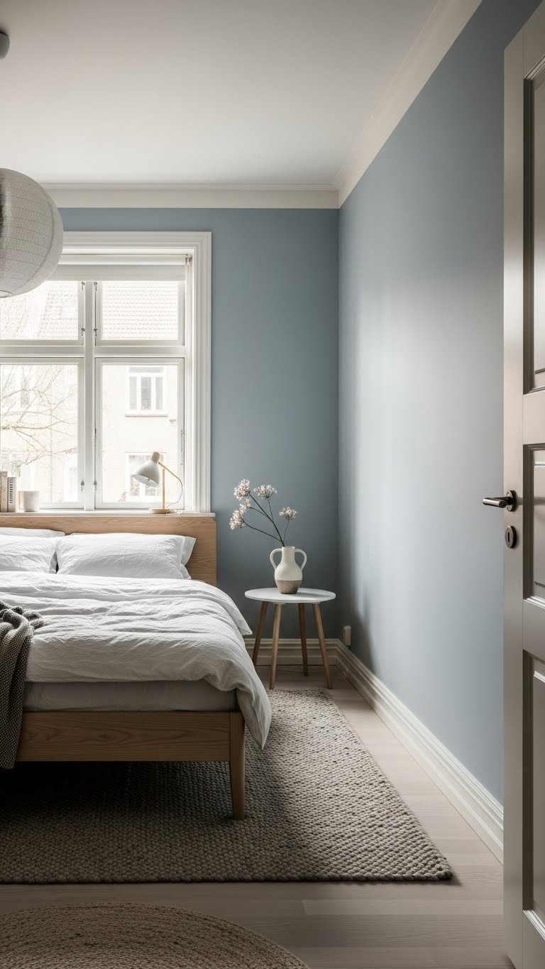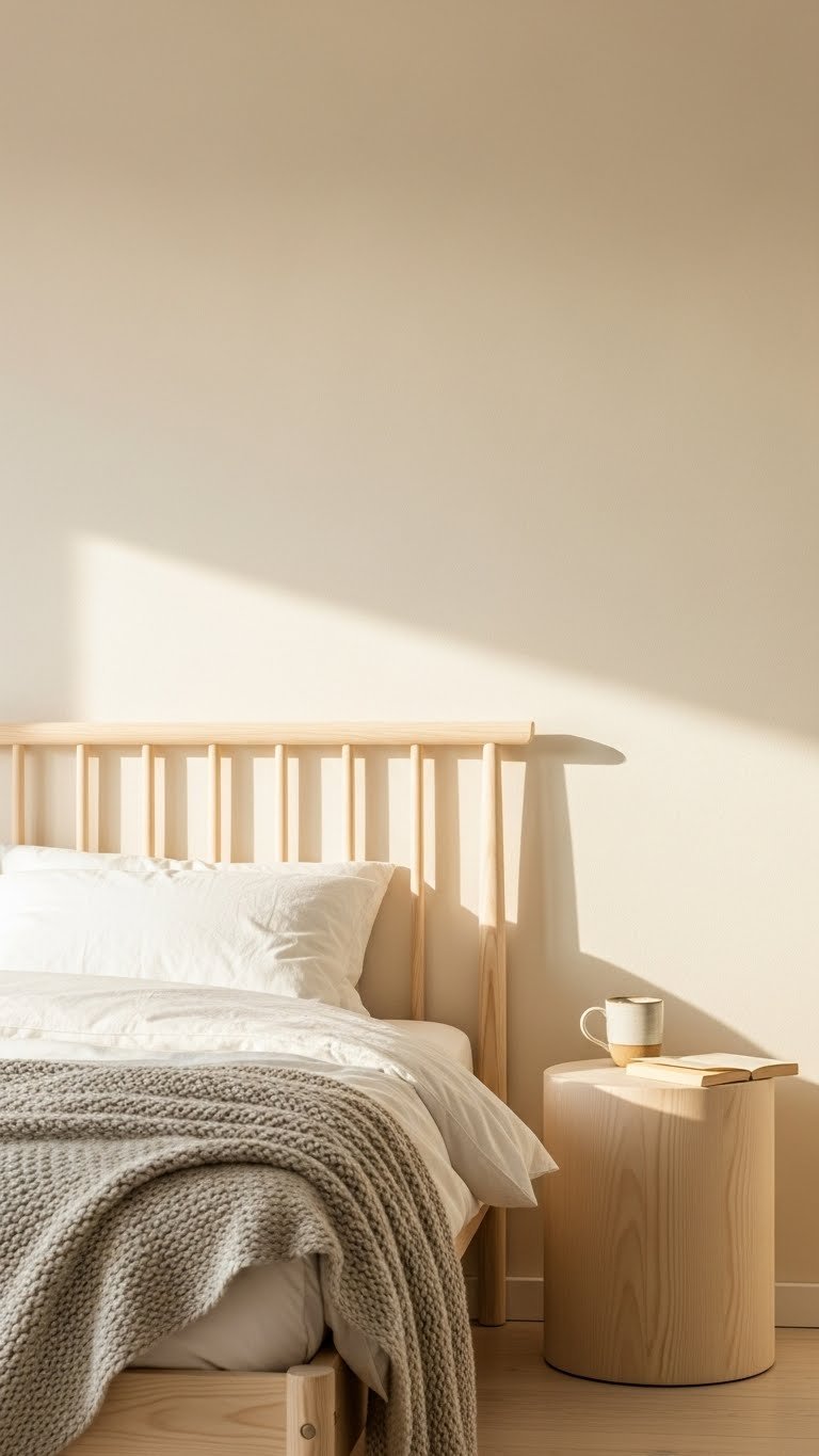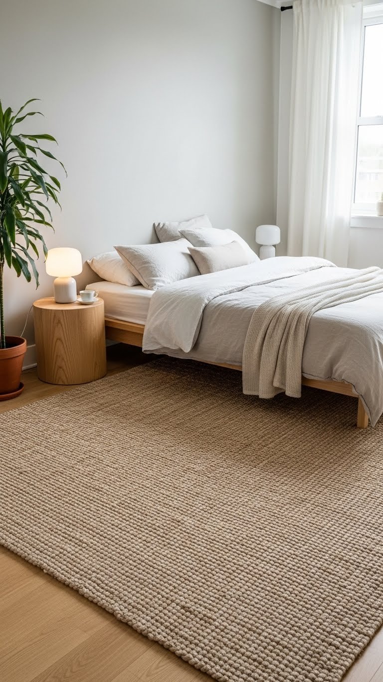 Layer a jute or sisal rug ($100–$300 for 8×10) under your bed or across the room. Rugs USA, Wayfair, and IKEA stock these affordably. Place it before making your bed so it anchors the space. A good rug lasts 5–7 years and ages beautifully. Vacuum weekly and spot-clean with mild soap. Pair it with soft socks or light carpet slippers for texture underfoot—small sensory touches matter in Scandinavian design.