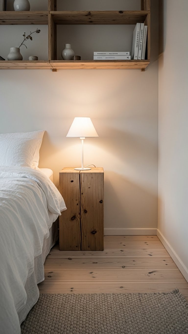 Replace glossy MDF nightstands with solid wood pieces—try IKEA’s RAST ($40–$60, unfinished pine), Wayfair’s raw wood options ($80–$300), or thrift secondhand furniture and lightly sand to reveal the wood grain. Raw wood ages beautifully, developing patina over years. These pieces take zero assembly or simple 15-minute setup. Pair them with soft linens and minimal decor so the wood’s natural beauty stands out.