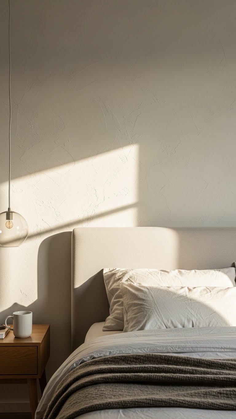 Paint all four walls or just your accent wall with a warm neutral like Benjamin Moore “Swiss Coffee” or Sherwin-Williams “Accessible Beige” ($40–$60 per gallon). A single quart covers most accent walls. This takes one weekend with a roller and tray ($15 total supplies if you already have them). The shift is subtle but noticeable—your bedroom suddenly feels inviting rather than sterile, and it pairs beautifully with natural wood furniture and soft textiles.
