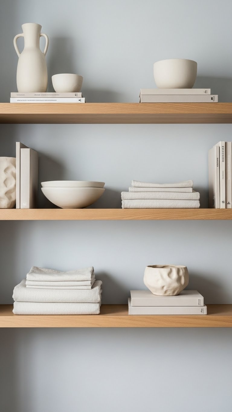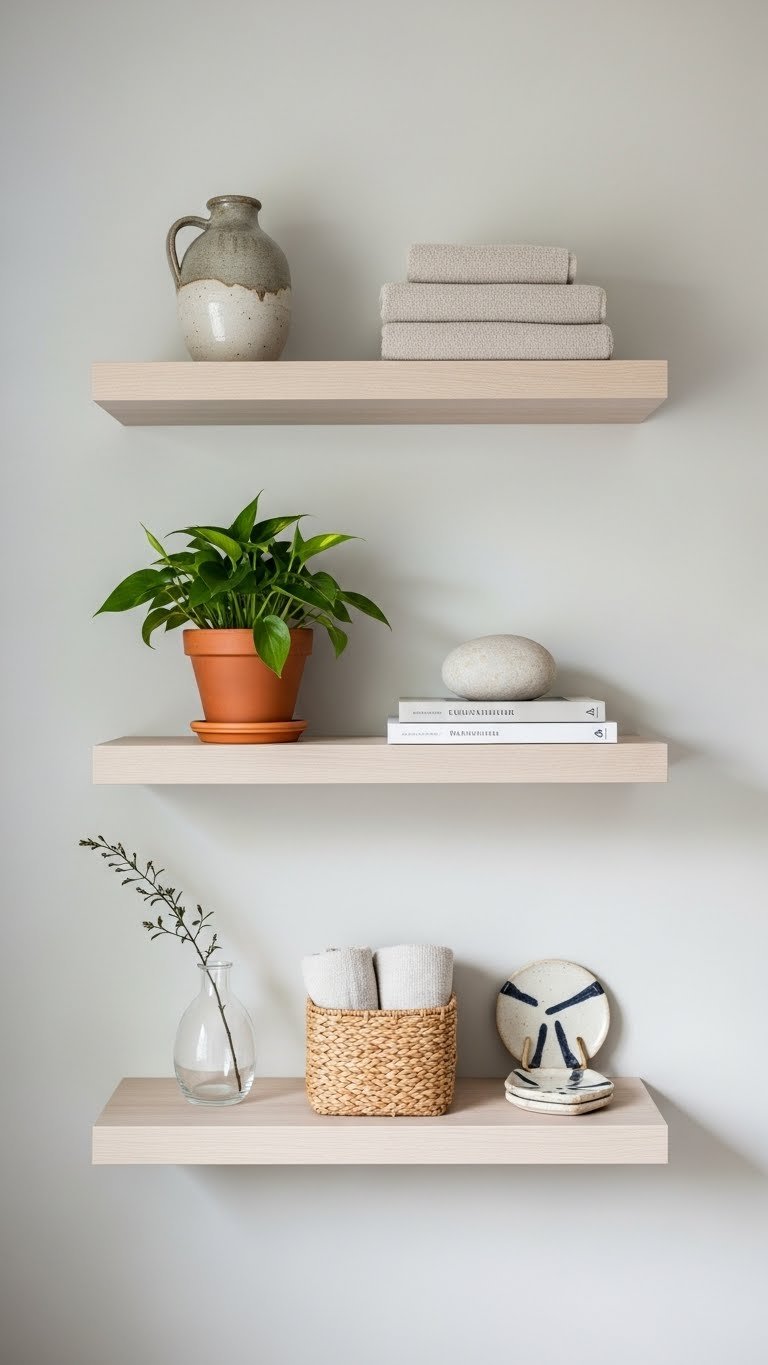 Install floating shelves ($30–$80 per shelf, hardware included) using wall studs. Arrange items in groups of three using negative space—a ceramic bowl, folded linens, one small plant, a book. Thrifted ceramics ($5–$15 each) and library books cost nothing. Installation takes 30–45 minutes with a drill. Keep items on the shelf touching only 40–50% of the surface; the empty space is part of the design.