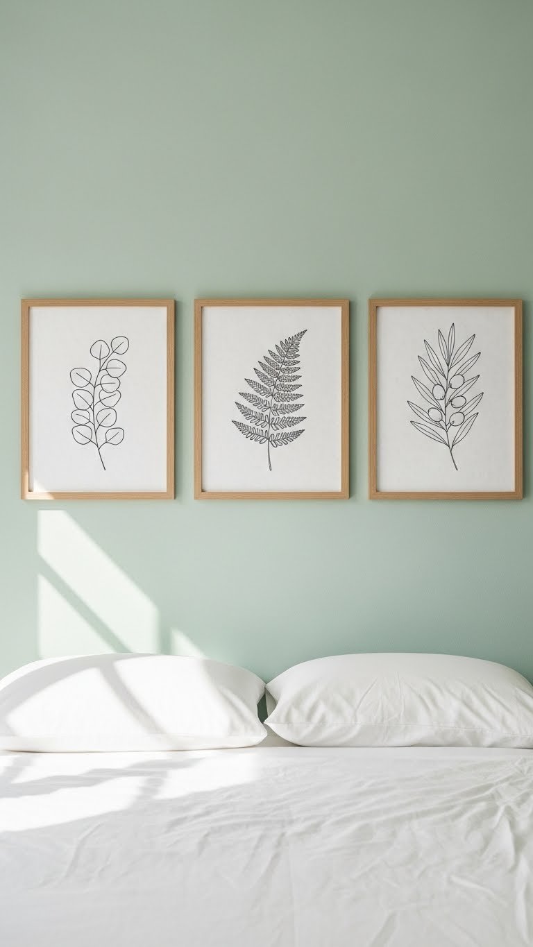 Commission prints from Etsy ($25–$60 each) or buy gallery-quality options from Minted, Desenio, or local artists ($40–$150 per print). Stick with florals, botanicals, or abstract line work in blacks, grays, and golds for cohesion. Frame in natural wood ($15–$40 per frame) and hang above your bed or accent wall. Arrange three prints in a grid or salon-style layout—measure, use a level, hang in 30 minutes. This is a renter-friendly update if you use damage-free hanging strips.