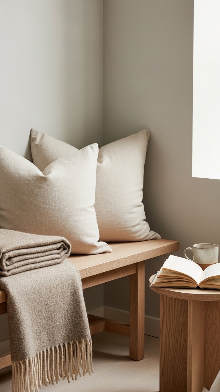 Place a low wooden bench ($80–$200, IKEA or thrift) in a corner near the window. Layer it with linen or wool cushions and a throw ($30–$100 total). Add a small side table and a book. This takes 15 minutes to arrange and zero installation. Use this corner as your phone-free morning routine zone. The visual break creates a secondary focal point and makes your room feel purposeful.