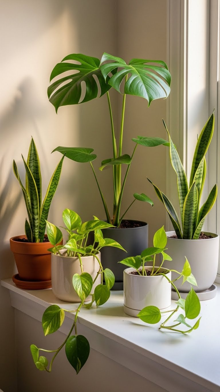 Group 3–5 plants on your windowsill or in a corner ($10–$40 per plant for low-maintenance varieties like snake plant, pothos, or ZZ plant). Use simple ceramic or terracotta pots ($8–$20 each) for visual cohesion. Water weekly and rotate quarterly for even growth. Plants require five minutes of care per week. Clustered groupings feel intentional; scattered singles read chaotic.