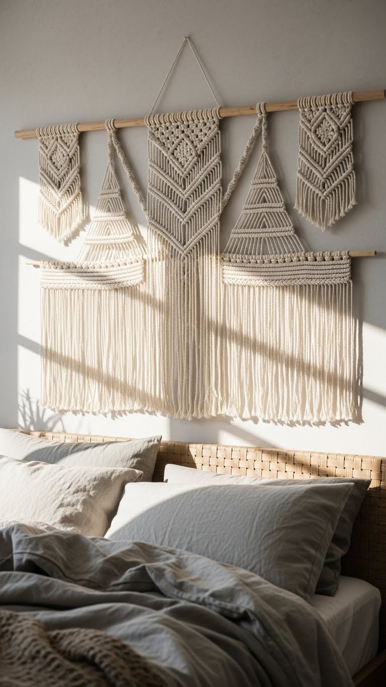 Source a minimalist macramé hanging ($30–$100) from Etsy, Urban Outfitters, or Anthropologie. Look for neutral colors and simple geometric patterns—avoid heavily fringed or overly complex designs. Hang with a single nail or adhesive hook. This takes five minutes and renter-friendly options exist. One statement piece above the bed or two smaller ones flanking a mirror work well. Dust quarterly with a soft brush.