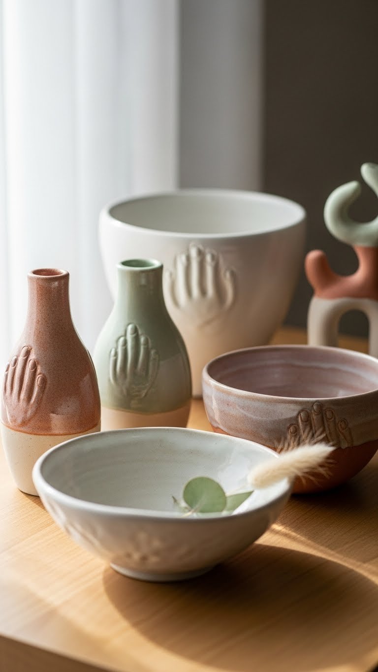 Buy pieces from local potters, Etsy artists ($30–$150 per piece), or take a pottery class and make your own ($100–$300 for a workshop). Display on floating shelves or a dresser in odd numbers (three or five pieces). Handmade items have visible imperfections—that’s their charm. No installation required; arrange and dust quarterly.