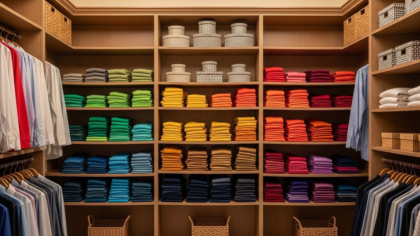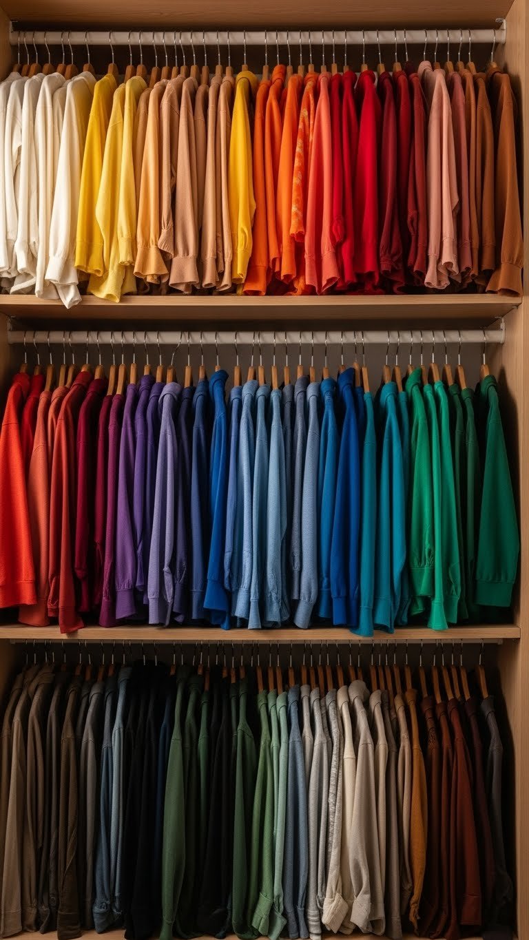 Sort all clothing into rainbow order: whites and neutrals, then yellows, pinks, reds, oranges, blues, greens, purples, grays, blacks. Takes 1–2 hours depending on wardrobe size. Keep this system by folding or hanging in color sequence. Take a photo of your color-organized closet for reference when shopping—you’ll naturally pick pieces that coordinate. No products needed, just intention and time.