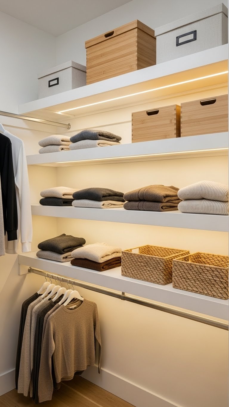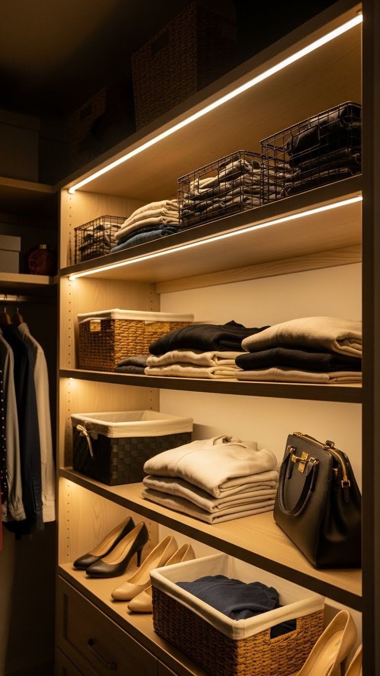Lighting is the secret ingredient that transforms a closet from purely functional to something you want to open. LED strips cost almost nothing and make everything easier to see and access.