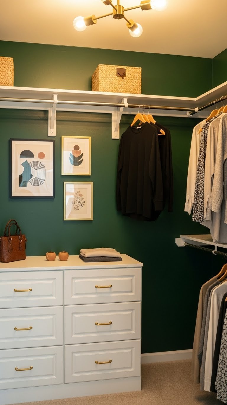 A moody wall color makes your closet feel like an intentional retreat, not just a storage box. Deep greens, navy, or charcoal create a boutique-like backdrop without eating space.