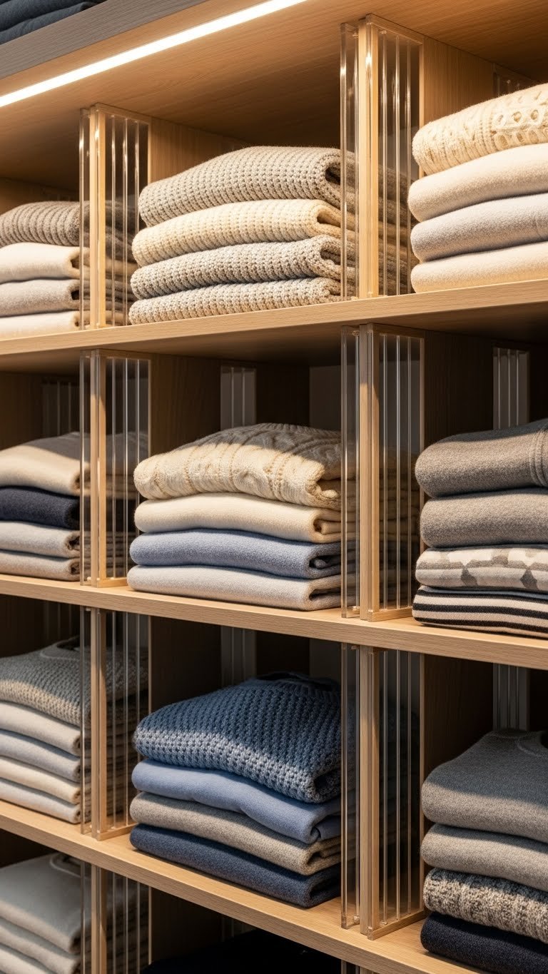 Buy acrylic or wood dividers from Container Store, Muji, or Amazon ($2–$8 each); you’ll need 2–4 per shelf depending on width. Place them every 4–6 inches and stack folded items between them. Takes 10 minutes to set up. This method (sometimes called KonMari-style) works best with medium-weight items like sweaters, jeans, and tees. Lighter fabrics can shift, so use clips or velcro dots ($5–$10) if needed.