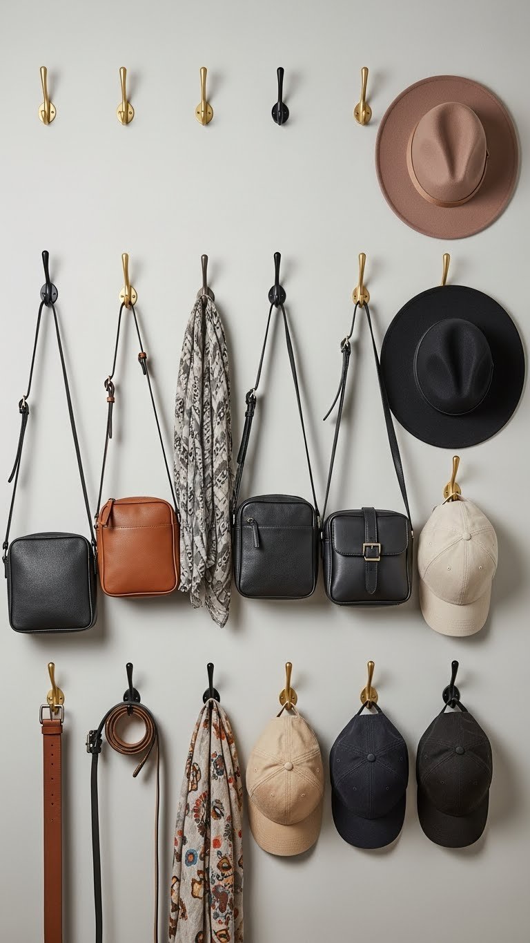 Install adhesive hooks ($0.50–$2 per hook from Target or Dollar Store) for a renter-friendly option, or screw-mounted hooks ($1–$5 from Home Depot) for permanent solutions. Space them 6–8 inches apart and group by type: belts together, bags together, scarves together. Spend 20 minutes hanging them once you decide placement. Avoid overloading—hooks work best with 1–2 items each so nothing wrinkles.