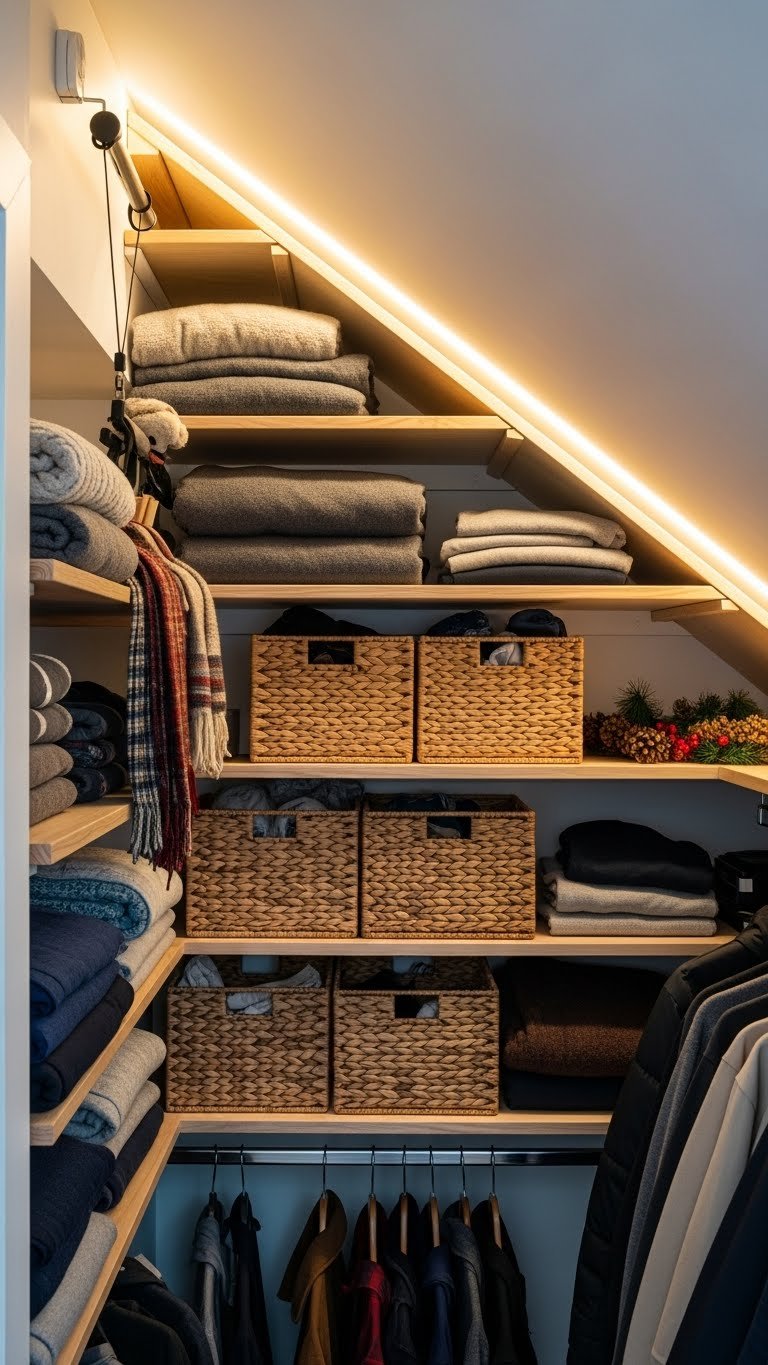 Measure your ceiling slope carefully (height at the wall and at the furthest point). Order custom shelves from Organized Living, Elfa, or hire a local carpenter ($100–$300 depending on complexity). If DIY-curious, buy basic shelving and trim it with a circular saw ($50–$100 tool investment). Installation is 30 minutes to 2 hours depending on brackets and angle. This only works if you have a sloped or angled area; otherwise skip this one.