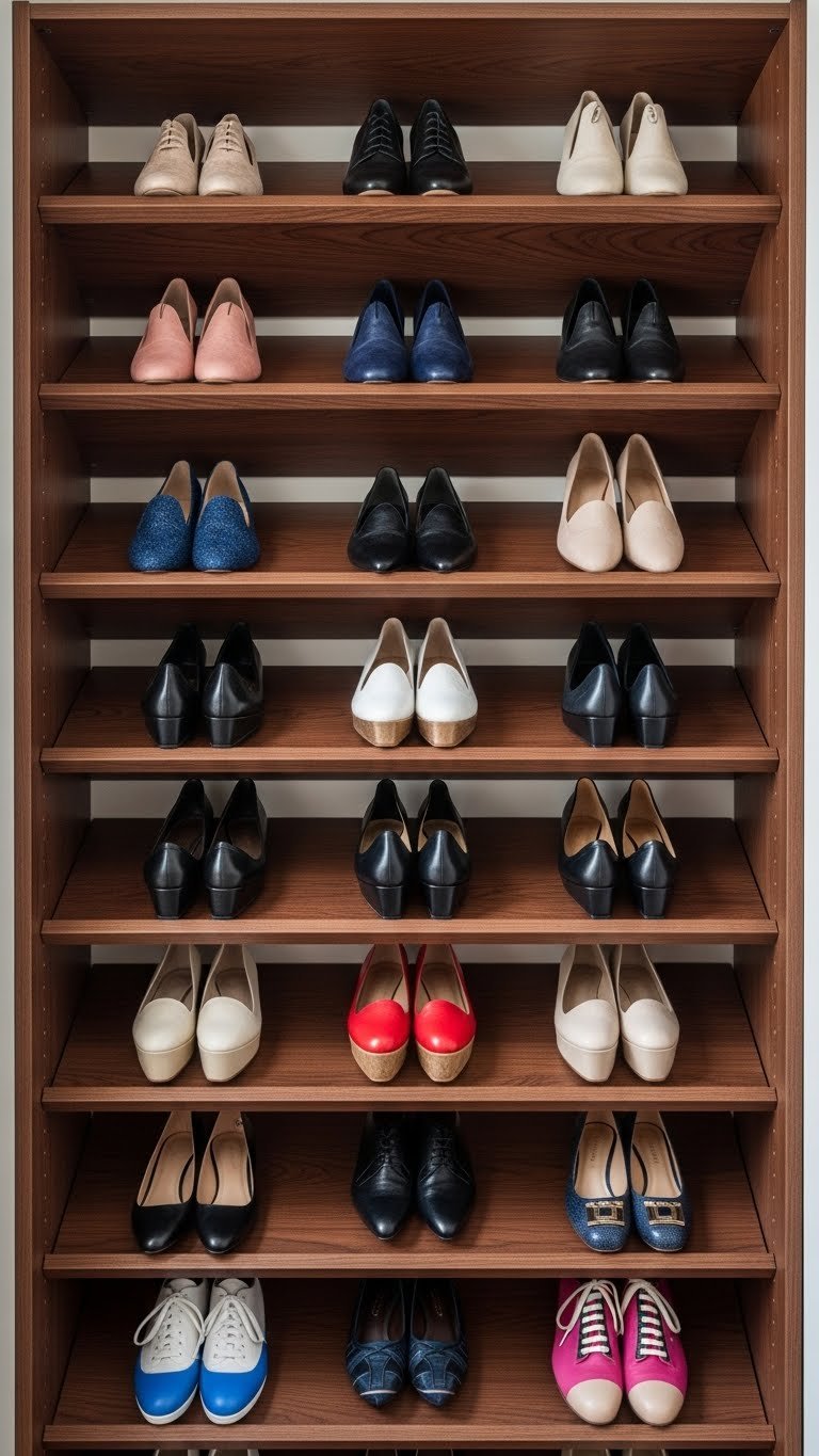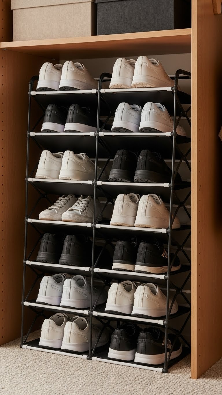 Shoes are space killers when laid flat—they hide and pile up. A tiered organizer makes them visible, protects them from dust, and actually doubles the shoes you can store per shelf.